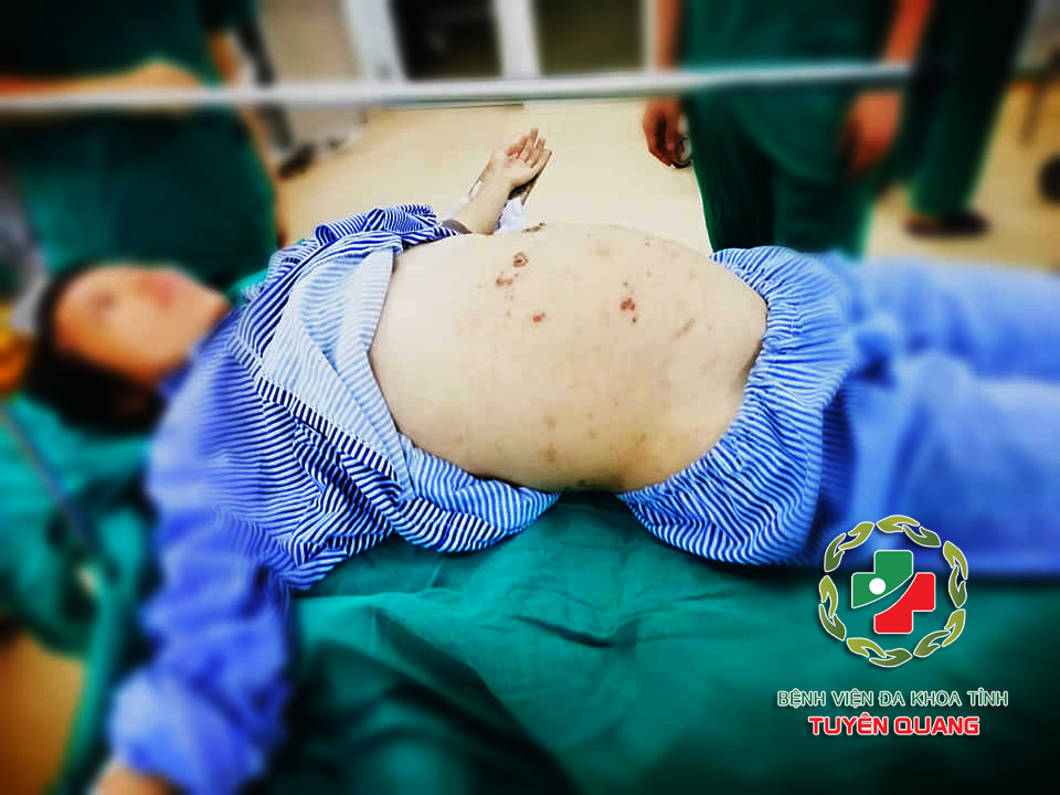 Gia đình bệnh nhân N cho biết, các đây khoảng 1 năm, bệnh nhân N bị đau bụng, đã đi khám và phát hiện có khối u nang buồng trứng nhỏ, đã về nhà tự sử dụng thảo dược (không rõ nguồn gốc) và “đốt ngải” để điều trị nhưng không đỡ, bụng ngày càng to hơn. Gần đây, bệnh nhân đau bụng nhiều, bí đại tiện, nên nhập viện khám ngày 13/3, trong tình trạng bụng chướng căng, da niêm mạc nhợt, xanh. Kết quả siêu âm cho thấy hình ảnh khối dịch lớn, chiếm toàn bộ ổ bụng.