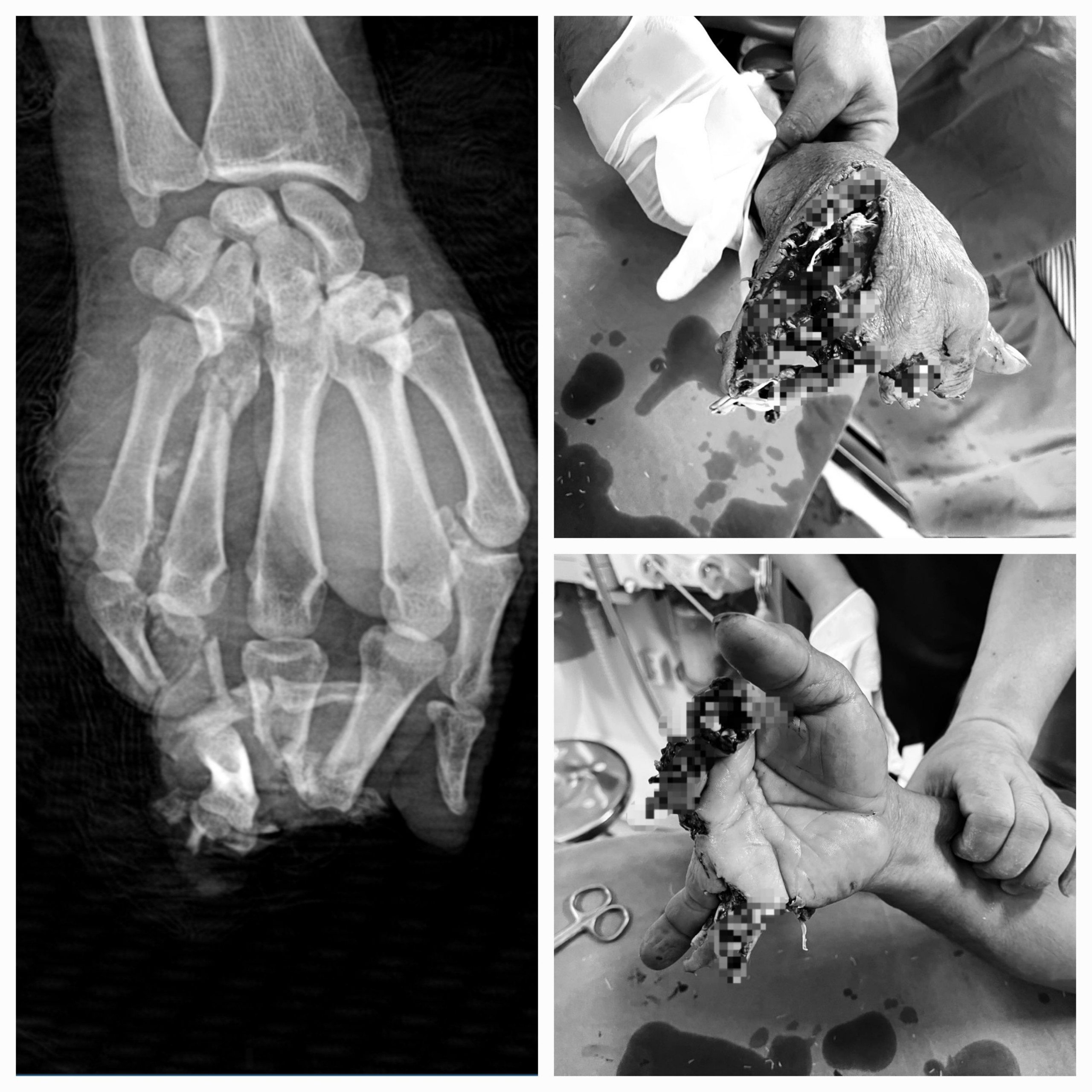 Nam bệnh nhân (ở xã Phúc Sơn, huyện Lâm Bình) bị máy bào cắt vào bàn tay phải. Được người nhà đưa đến TTYT huyện Chiêm Hóa trong tình trạng ngón 2, 3,4,5 bàn tay phải vết thương dập nát hoàn toàn, mất ngón, khuyết da che phủ phần mềm, chảy máu.