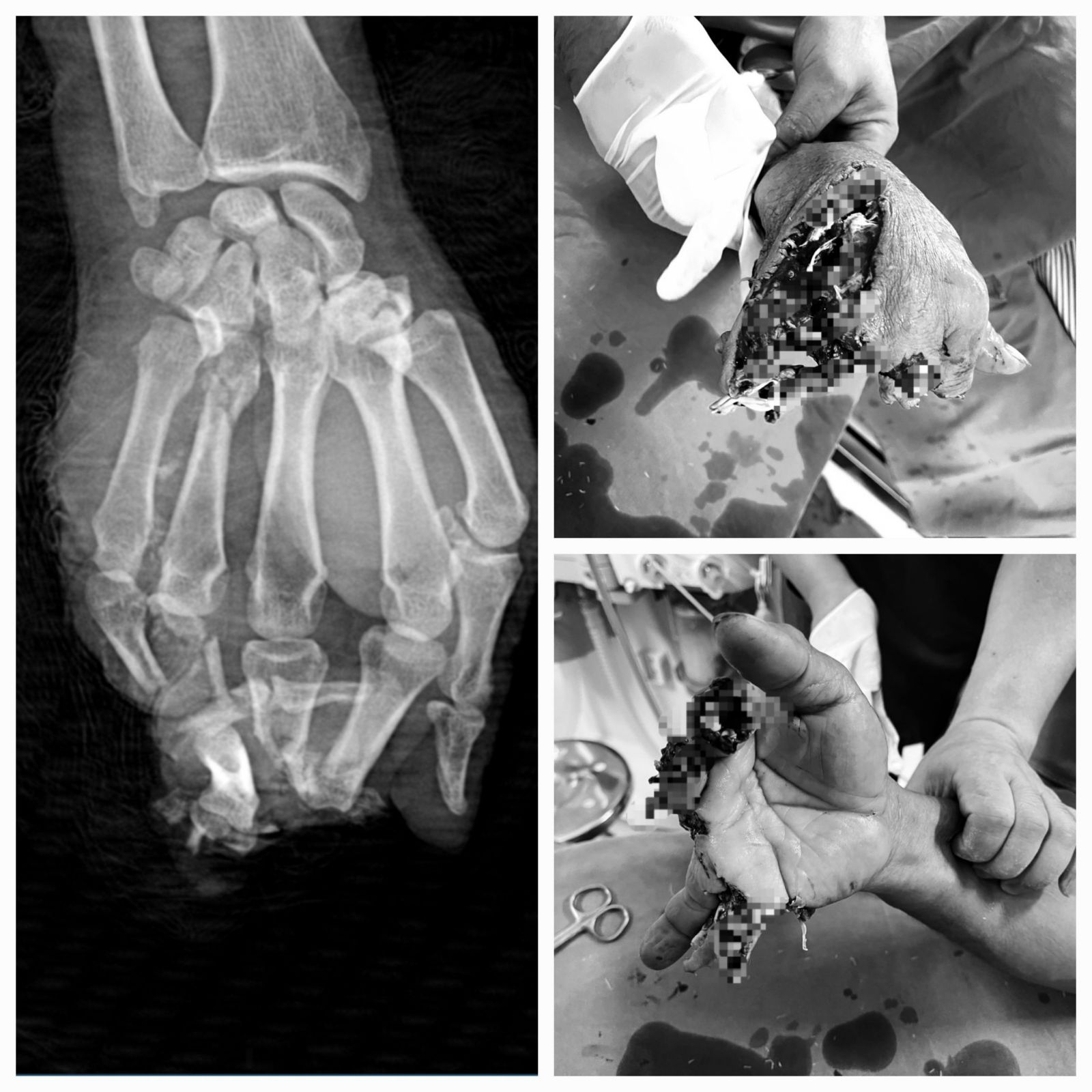 Bệnh nhân nhanh chóng được cầm máu, cố định vết thương và chuyển phẫu thuật ngay sau đó. Theo đó, các Bác sĩ đã tiến hành cắt lọc bơm rửa lấy hết dị vật trong vết thương, cắt lọc tổ chức dập nát làm sạch vết thương, tạo mỏm cụt các đầu chi, cắt lọc bảo tồn gân, cố định xương gãy ở tư thế chức năng, khâu nối lại hệ thống gân bị đứt…