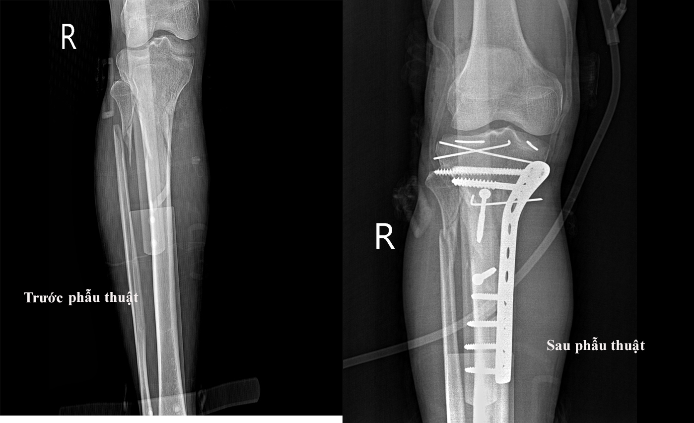 Bệnh nhân đã được kiểm tra sau kết hợp mâm chày, xương chày phải, hiện tại hai xương thẳng trục. Do ổ gãy nhiều mảnh rời phức tạp nên bệnh nhân phải mất thời gian dài để ổn định.