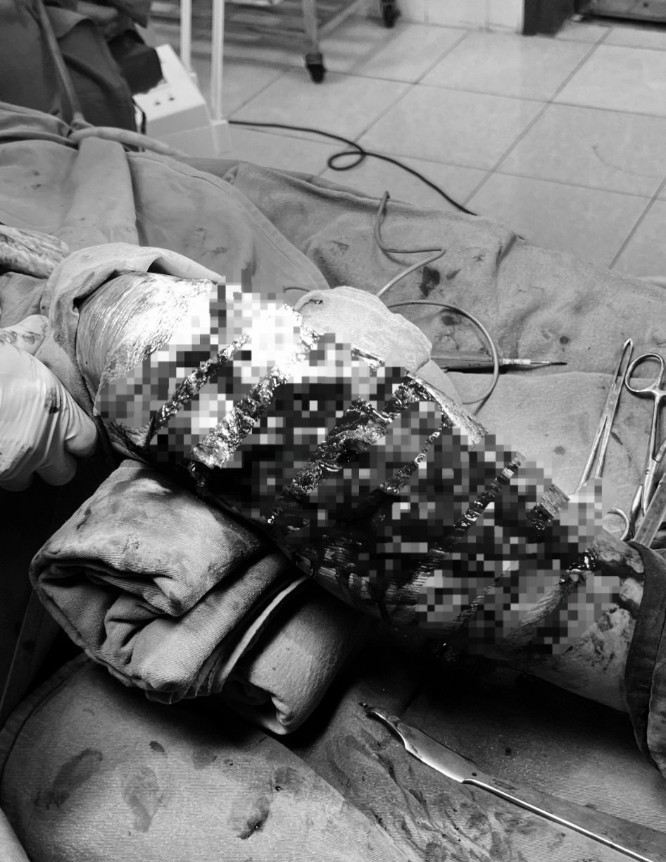Trong quá trình phẫu thuật, các bác sĩ phát hiện mâm chày ngoài vỡ lún. Các bác sỹ tiến hành làm sạch ổ gãy, đẩy mâm chày trong về bình diện giải phẫu, kết hợp xương bằng 02 đinh kischner. Tiếp tục rạch da mặt trong tách tổ chức dưới da, qua các lớp cân cơ, cắt sụn chêm ngoài bộc lộ ổ gẫy. Qua kiểm tra: mâm chày trong gẫy thành nhiều mảnh nhỏ, lan xuống thân xương, kíp mổ tiến hành làm sạch ổ gãy, đặt lại các mảnh xương theo bình diện giải phẫu kết hợp xương bằng 01 nẹp 12 lỗ, 8 vít.