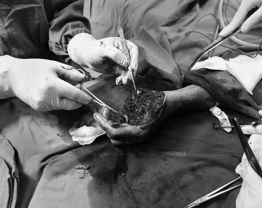 Đồng thời tiến hành xử lý vết thương lòng bàn chân, vết thương đùi. Sau phẫu thuật, bệnh nhân được đưa về theo dõi và chăm sóc tại khoa.