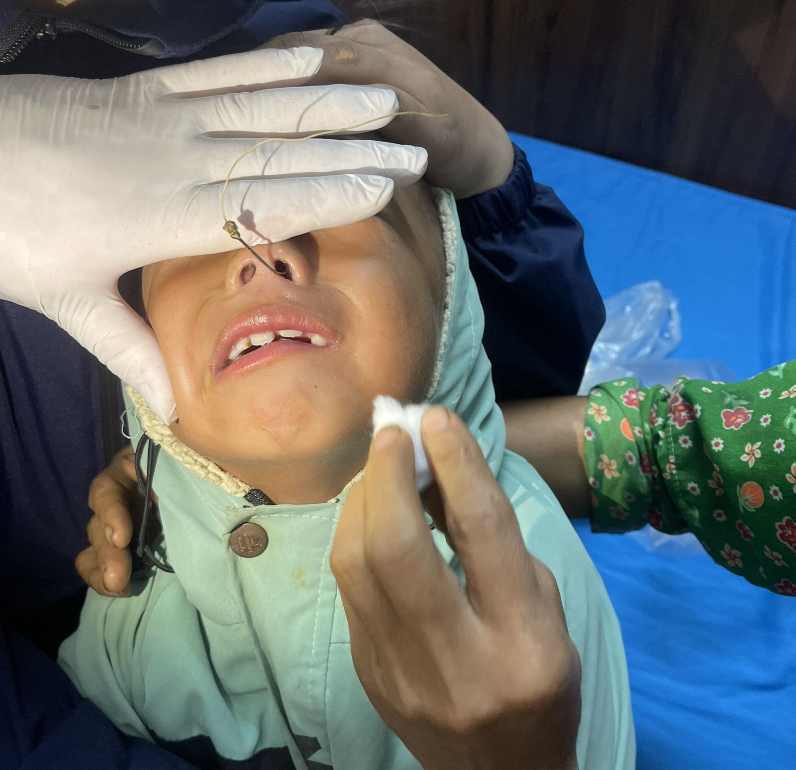 Bệnh nhi V.A.V được đưa đến cấp cứu tại Trung tâm Y tế huyện Chiêm Hoá trong tình trạng tỉnh táo, mũi trái bị dị vật găm, vết thương không chảy máu nhiều. May mắn dị vật ở vị trí dễ xử lý các bác sỹ đã tiến hành gỡ móc câu ra khỏi mũi trái cho bệnh nhi an toàn.