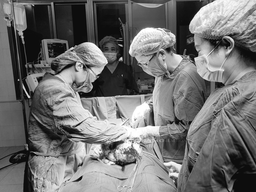 BS CK1 Hà Thị Bích Ngọc- PGĐ TTYT huyện Chiêm Hoá đã trực tiếp thực hiện phẫu thuật. Kíp phẫu thuật đã tiến hành bóc tách dính, lấy khối u giải phóng chèn ép ổ bụng. Khối u to kích thước 30x20cm, bị toàn bộ mạc nối lớn và các quai ruột dính vào mặt trước khối u và dính vào thành bụng bên trái, cắm sâu trong tiểu khung.
