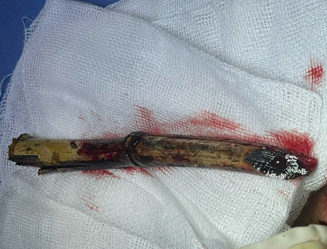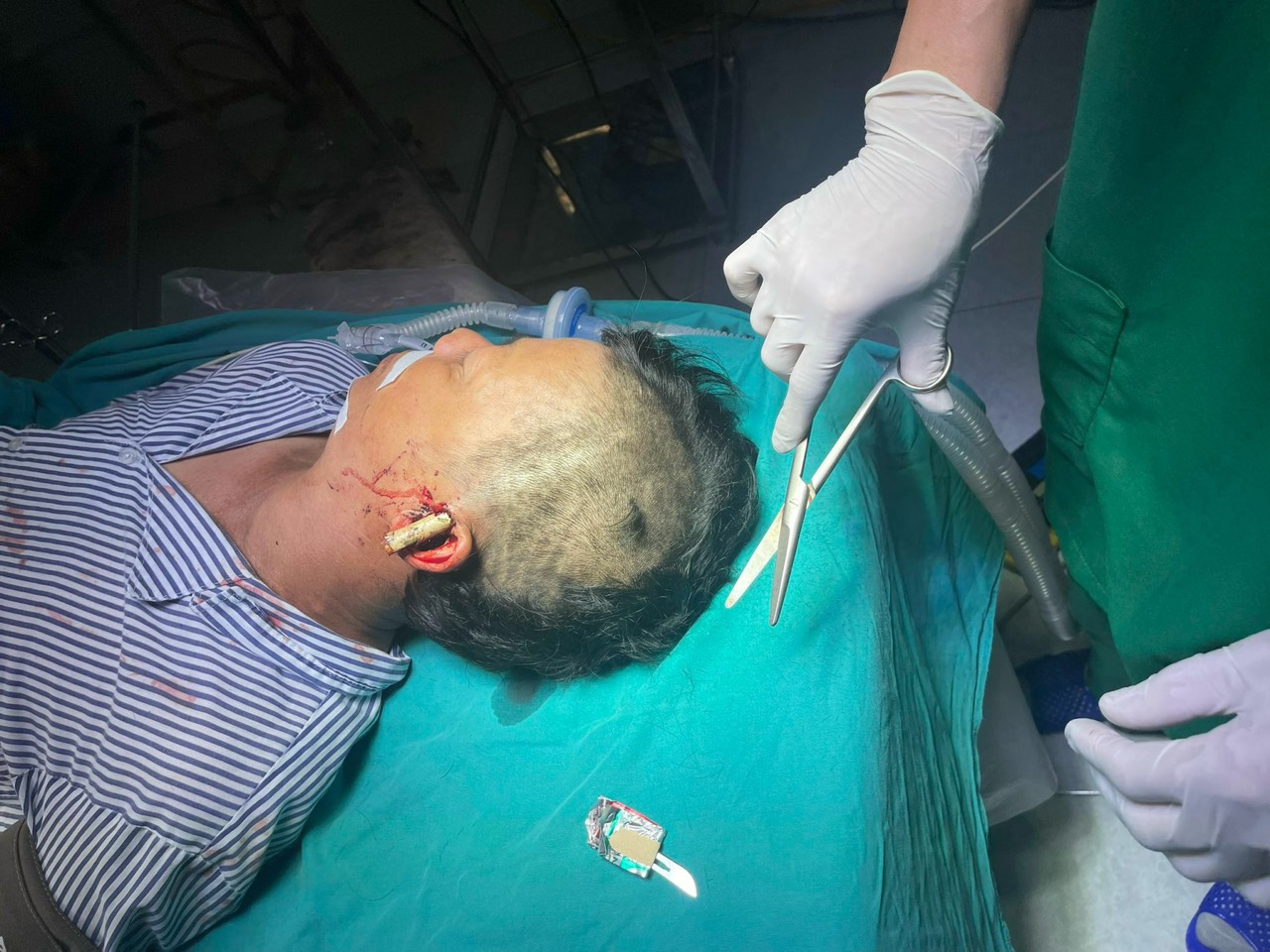 Bệnh nhân nhanh chóng được làm các xét nghiệm cần thiết và được tiến hành phẫu thuật. Kíp phẫu thuật mở băng thấy vết thương khuyết da, nham nhở, rỉ rả máu vùng mang tai Trái, dị vật là que Tre dài 15cm đâm xuyên thấu vùng mang tai thái dương (T). Tiến hành rạch da vùng dị vật thấy nhiều dị vật gẫy vụn, dâm xuyên tổ chức cân cơ dập nát, lộ xương. Các bác sỹ tiến hành cắt lọc làm sạch vết thương rạch vạt da cạnh vết thương, phẫu tích giữ cuống, di chuyển vạt da đến che phủ xương khâu cố định vạt. Hiện, tình trạng sức khỏe bệnh nhân tiến triển tốt.