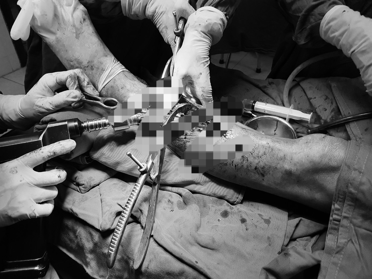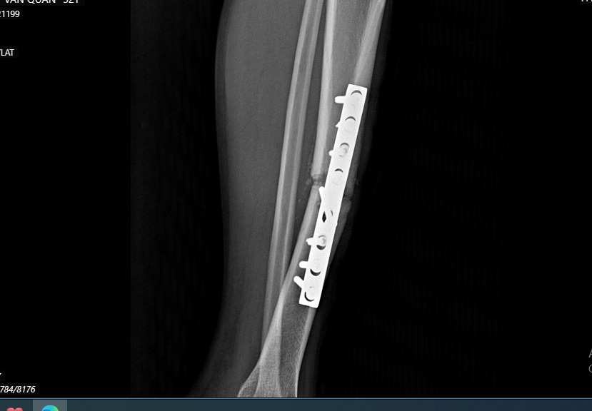 Ekip phẫu thuật đã rạch da theo bờ trước xương chày phải, tách tổ chức dưới da qua các lớp cân cơ vào ổ gãy, thấy xương chày 1/3 giữa di lệch hoàn toàn, khuyết xương mặt sau. Các bác sỹ đã lấy xương xốp và vỏ xương đoạn gai chậu trước trên ghép vào mặt sau xương chày. Đồng thời, tiến hành làm sạch ổ gẫy và kết hợp xương bằng nẹp 8 lỗ 08 vít. Sau gần 2 giờ, ca phẫu thuật thành công. Hiện nay, bệnh nhân đang được điều trị tại khoa ngoại.