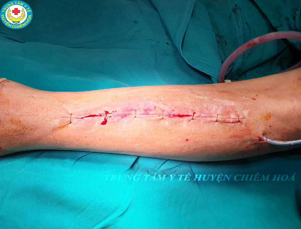Vừa qua, Trung tâm Y tế huyện Chiêm Hoá phẫu thuật thành công cho bệnh nhân L.V.Q 51 tuổi, xã Hồng Quang, huyện Lâm Bình bằng phương pháp ghép xương mào chậu vào ổ khuyết xương cẳng chân. Trước đó 5 tháng, người bệnh bị tai nạn xe máy, cẳng chân trái có vết thương gãy hở phức tạp, đã phẫu thuật. Khi nhập viện bệnh nhân sưng đau cẳng chân trái. Qua thăm khám tại mặt trước cẳng chân trái có sẹo mổ cũ kt 15cm, biến dạng cẳng chân, sẹo mổ cũ liền tốt, vận động cẳng chân trái đau, cơ lực tay phải 4/5, khối áp xe nách phải đã hoá mủ. Kết quả chụp XQ xương cẳng chân có hình ảnh xương tương đối thẳng trục, đang can. Các BS chẩn đoán gãy nẹp vis xương cẳng chân trái/ di chứng tai biến mạch mãu não và chỉ định mổ.