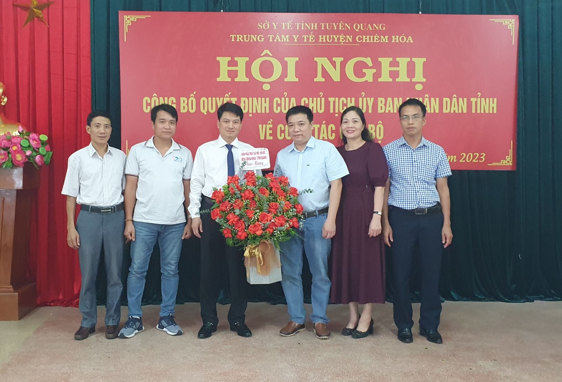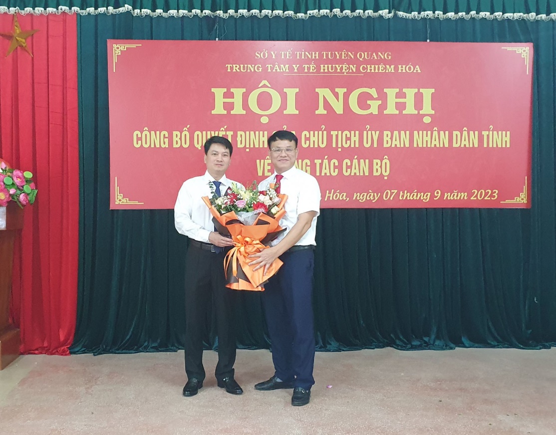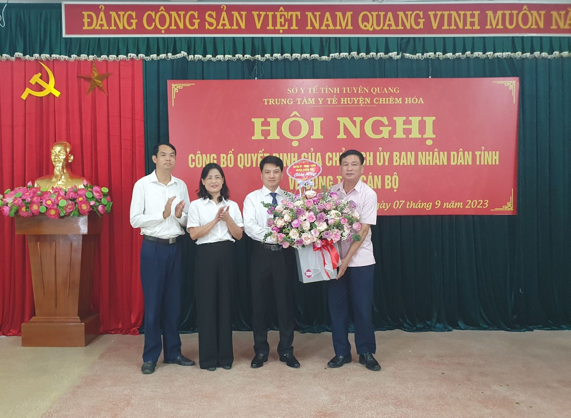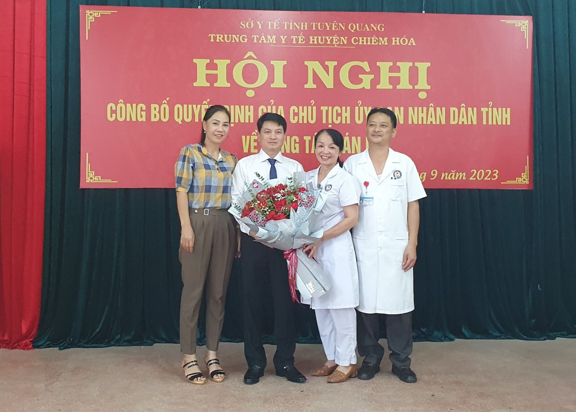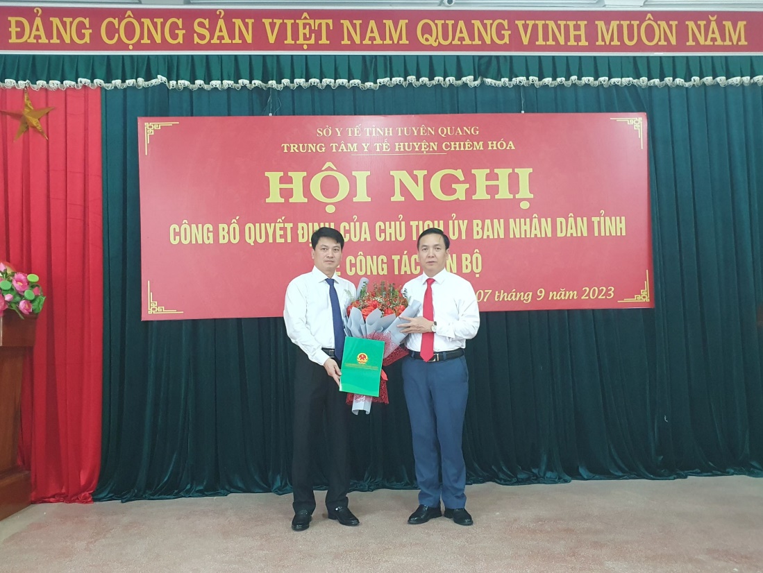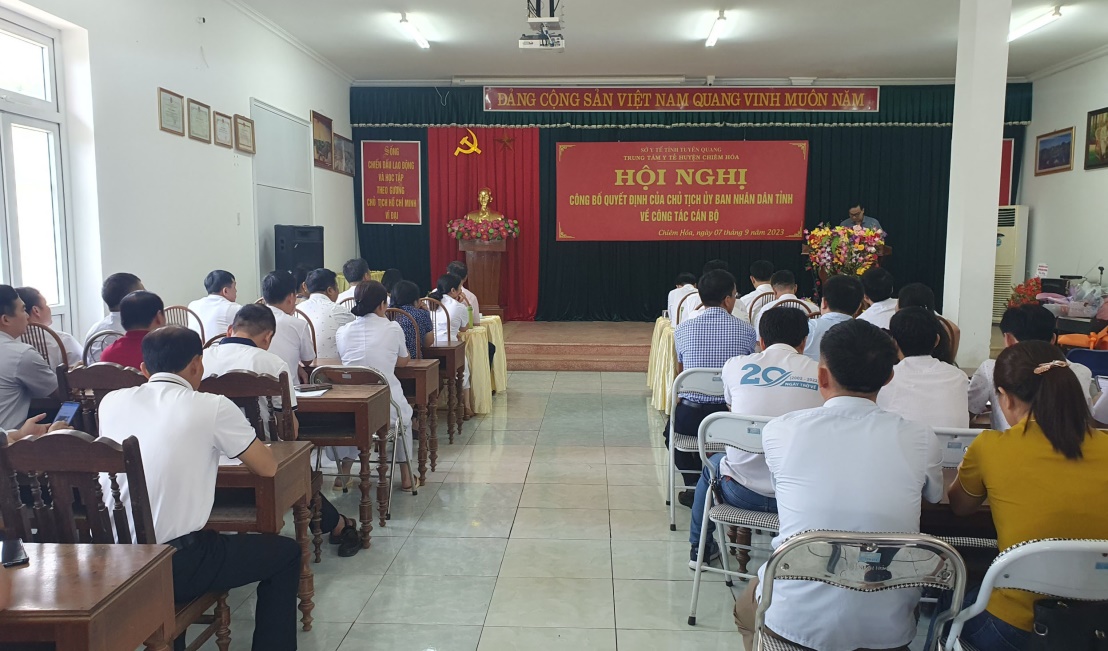 Sáng ngày 07/09/2023, tại TTYT huyện Chiêm Hoá, sở Y tế tỉnh Tuyên Quang đã tổ chức Hội nghị công bố quyết định về việc bổ nhiệm Giám đốc Trung tâm Y tế huyện Chiêm Hoá. Dự Hội nghị về phía tỉnh có Lãnh đạo Sở Y tế; trưởng, phó các phòng thuộc sở; Lãnh đạo và đại diện một số khoa phòng Bệnh viện đa khoa tỉnh Tuyên Quang. Về phía huyện có Lãnh đạo Huyện Uỷ, HĐND, UBND huyện Chiêm Hoá, Lãnh đạo, Trưởng, phó các khoa phòng Trung tâm Y tế huyện Chiêm Hoá.