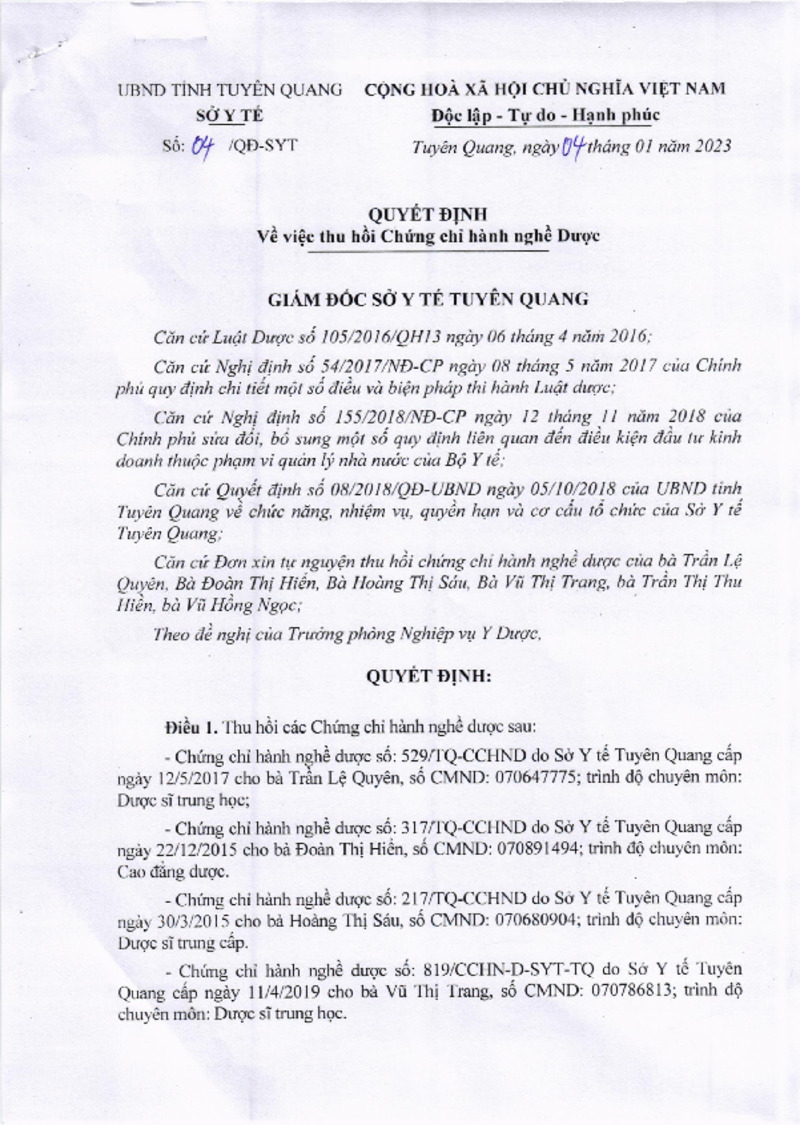 Ngày 04/01/2023, Sở Y tế ban hành Quyết định số 04/QĐ-SYT- QĐ v.v thu hồi chứng chỉ hành nghề dược