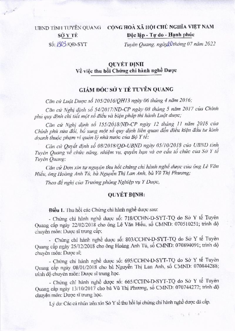 | Mô tả | Quyết định số 1303/QĐ-SYT về việc Thu hồi Chứng chỉ hành nghề Dược |