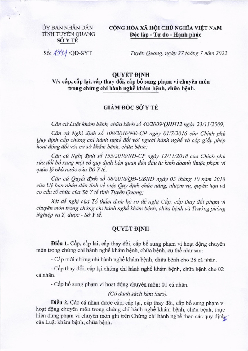 | Mô tả | Quyết định số 1341/QĐ-SYT về việc cấp lại, cấp thay đổi, cấp bổ sung phạm vi chuyên môn trong chứng chỉ hành nghề khám bệnh, chữa bệnh |