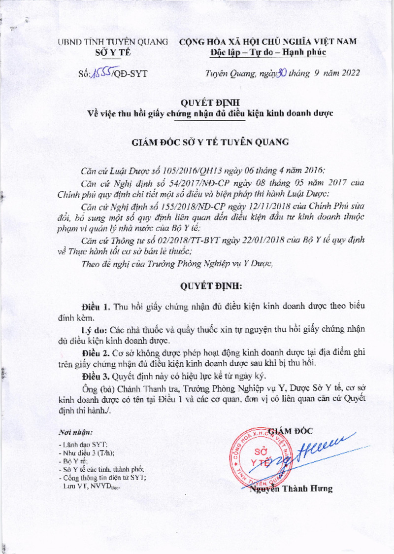 | Mô tả | Quyết định số 1555/QĐ-SYT về việc Thu hồi giấy chứng nhận đủ điều kiện kinh doanh dược |