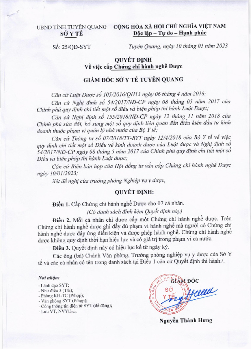 Ngày 10/01/2023, Sở Y tế ban hành Quyết định số 25/QĐ-SYT- QĐ v.v Cấp chứng chỉ hành nghề dược