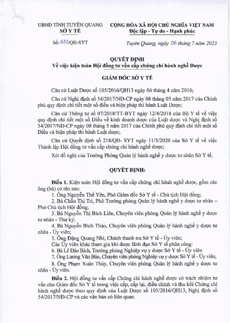 | Mô tả | Quyết định số 652/2023/QĐ-SYT về việc Kiện toàn Hội đồng tư vấn cấp chứng chỉ hành nghề Dược |
