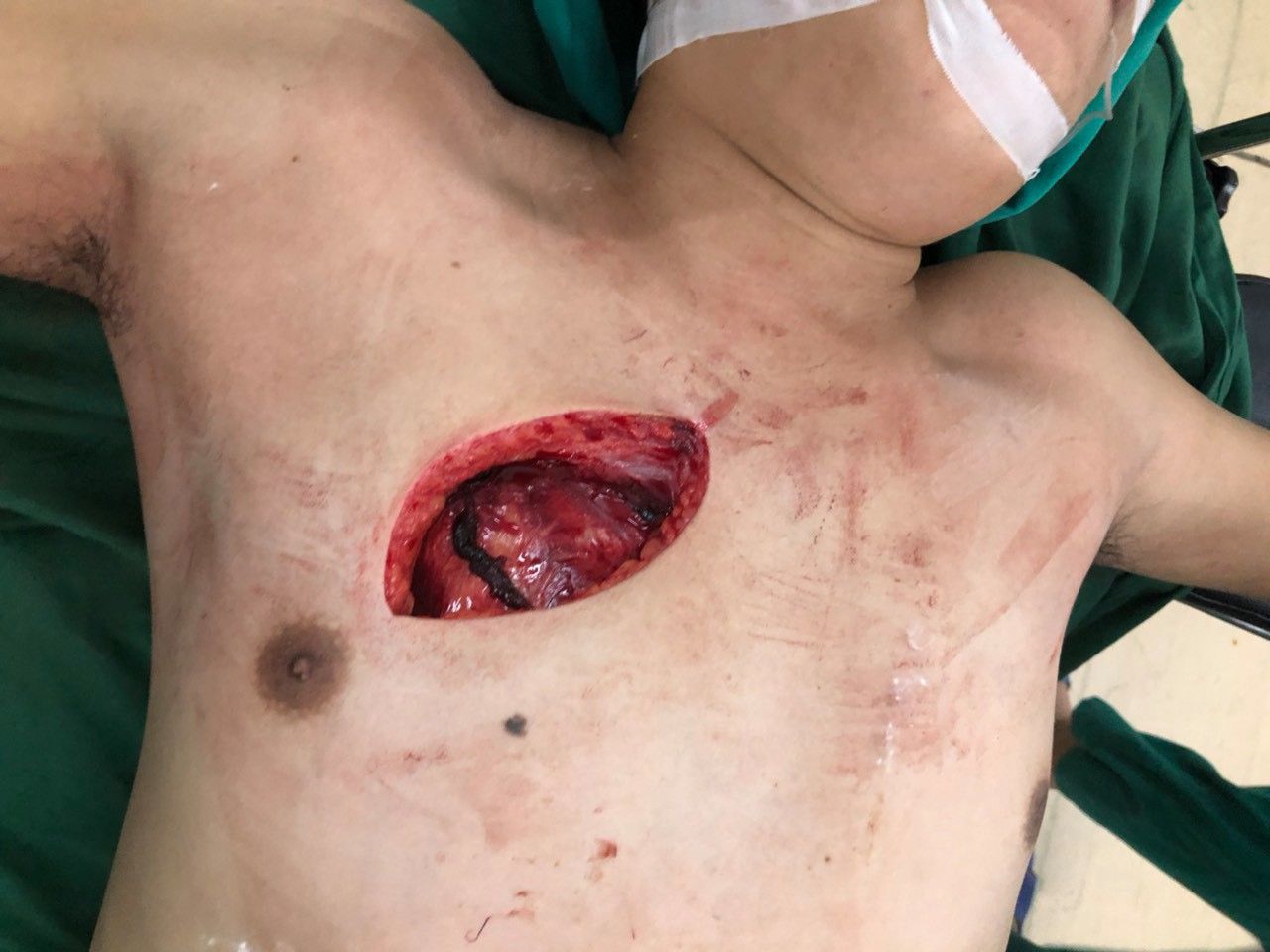 Trong 4 tiếng, kíp phẫu thuật tiến hành mở rộng vết thương đường giữa đòn phải thấy đứt cơ ngực lớn, cơ liên sườn, đứt rời xương sườn số 5,6,7 động mạch liên sườn chảy thành tia. Kíp phẫu thuật đã tiến hành cầm máu động mạch liên sườn và kiểm tra khoang màng phổi phải thấy có khoảng 800 ml máu cục lẫn không đông, có vết rách nhu mô thùy dưới phổi phải kích thước gần 8 cm, rách thủng cơ hoành phải gần 10 cm, qua vết rách cơ hoành có vết thương gan đang chảy máu. Kíp mổ đã tiến hành khâu vết rách nhu mô phổi, khâu cơ hoành. Sau khi kiểm tra không còn tổn thương khác đã đặt dẫn lưu khoang màng phổi và cố định xương sườn bằng chỉ thép; Kíp mổ tiến hành mở bụng, trong bụng chưa khoảng 700ml dịch máu, đồng thời hút, kiểm tra có vết thương gan hạ phân thùy 8 đang chảy máu kích thước gần 10 cm. Sau khi kiểm tra di động gan phải không có tổn thương khác, kíp mổ đã tiến hành khâu cầm máu vết thương gan, rửa sạch bụng đặt dẫn lưu và đóng bụng.