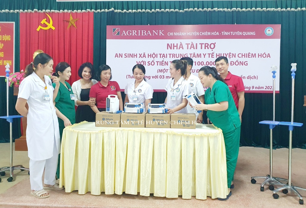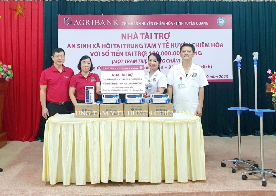 Chiều ngày 27/09, Agribank Chi nhánh huyện Chiêm Hoá đã trao tặng 03 bơm tiêm điện model: Infusia SP7s và 01 máy truyền dịch model Infusia VP7s, hãng sản xuất Fresenius Kabi Nanchang Co.,Ltđ/Đức trị giá 100 triệu đồng cho TTYT huyện Chiêm Hoá.