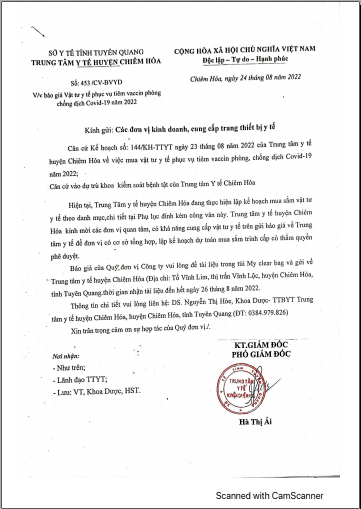 THƯ MỜI CHÀO GIÁ DỊCH VỤ VỆ SINH CÔNG NGHIỆP VÀ GIẶT LÀ PHỤC VỤ CÔNG TÁC KHÁM CHỮA BỆNH NĂM 2002 CỦA TRUNG TÂM Y TẾ HUYỆN CHIÊM HÓA