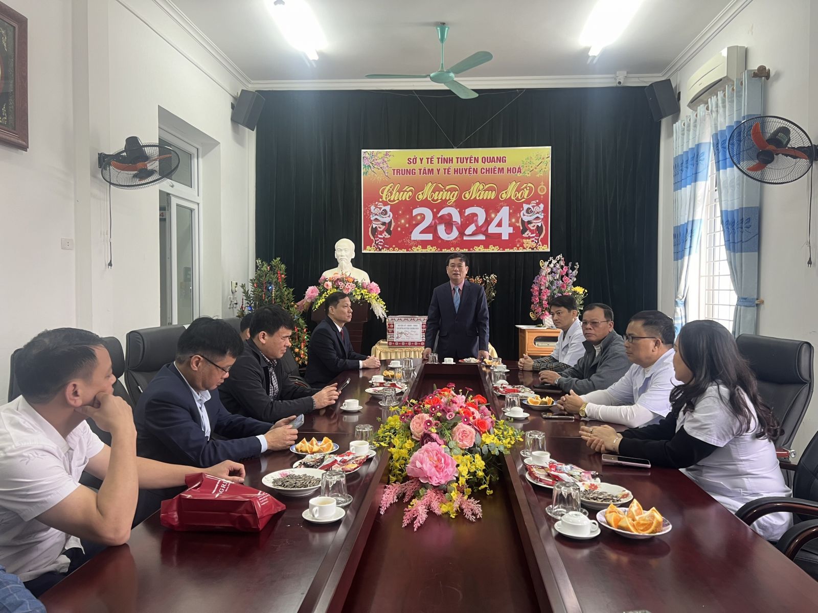 Tại đây, Đ/c Hà Đức Tập - Phó Bí thư Thường trực Huyện ủy, Chủ tịch HĐND huyện ghi nhận những nỗ lực và thành tích của đội ngũ y, bác sỹ Trung tâm đã đạt được trong thời gian qua. Đồng thời, mong muốn tập thể, cán bộ, y, bác sỹ tiếp tục nêu cao tinh thần trách nhiệm, chuẩn bị đầy đủ nhân lực, trang thiết bị, thuốc men phục vụ công tác khám chữa bệnh cho nhân dân trong dịp tết. Nhân dịp Tết Giáp Thìn 2024, đồng chí đã gửi lời chúc năm mới tới toàn thể cán bộ, nhân viên y tế và người lao động tại Trung tâm.
