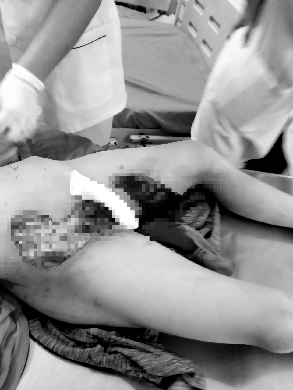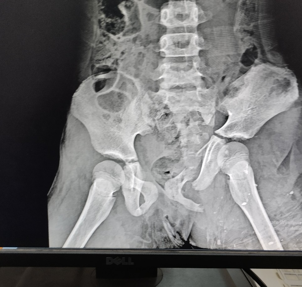 Qua thăm khám bệnh nhân bị rách vùng đùi bên trái, có kích thước 40x15 cm lộ gân cơ, vùng chậu phải có vết rách da 20x7 cm lộ cơ. Bệnh nhân được chỉ định chụp Xquang khung chậu thẳng. Kết quả cho thấy bệnh nhân bị gãy ngành ngồi háng và ngồi mu trái, gãy ngành ngồi mu bên phải. Nhận định tình trạng bệnh nhân nguy kịch, sau khi sơ cứu và hội chẩn kíp trực cấp cứu đã chuyển bệnh nhân lên tuyến trên điều trị tiếp.