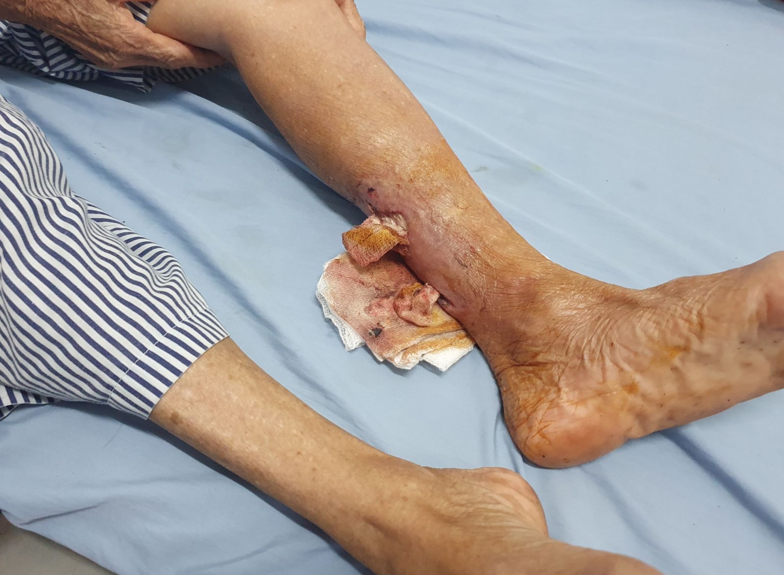 Bệnh nhân nữ 84 tuổi (xã Trung Hòa), vào viện do bị chó nhà hàng xóm cắn vào cẳng chân trước đó 1 tuần. Bệnh nhân nhập viện trong tình trạng vết thương chảy dịch, xung quanh sưng nề. Trong quá trình phẫu thuật, các bác sỹ kiểm tra vết thương của bệnh nhân có ổ mủ lan rộng ăn sâu sát xương, tổn thương hết phần cơ và gân vùng mặt sau cẳng chân.