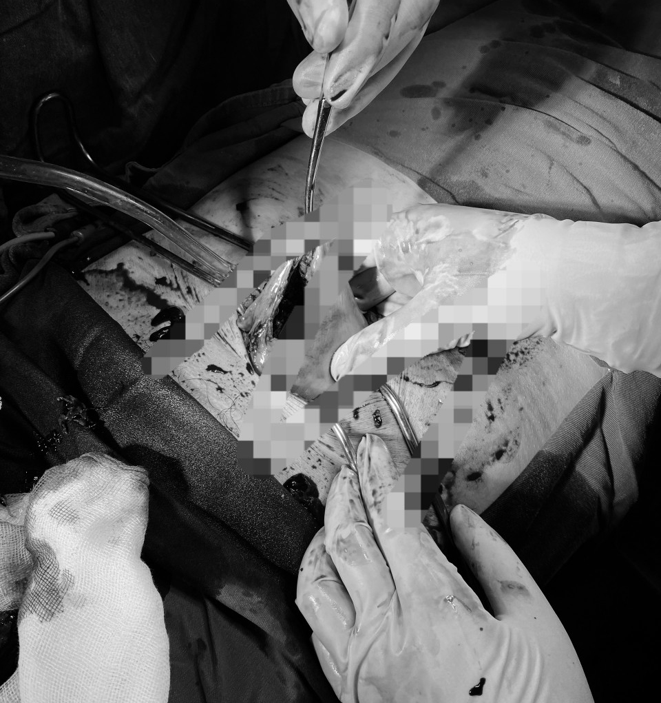 Quá trình phẫu thuật, ê kíp phát hiện ổ bụng có rất nhiều máu loãng lẫn cục máu đông, góc sừng phải tử cung vỡ, chảy máu, tổ chức thai đã ra ngoài ổ bụng, thai tương đương 13 tuần tuổi. Xác định đây là trường hợp nguy hiểm, các bác sĩ nhanh chóng truyền máu khẩn cấp, đồng thời lấy ra 2500ml máu loãng và 400g máu cục trong ổ bụng; lấy hết tổ chức rau và khâu phục hồi bảo tồn tử cung, cắt ống dẫn trứng phải, làm sạch ổ bụng, hạn chế tối đa đụng chạm vào tử cung. Bệnh nhân được truyền 6 đơn vị máu. Hiện tại, ngày thứ 3 sau mổ, tình trạng sức khỏe của bệnh nhân đã ổn định, bệnh nhân tiếp tục được theo dõi và chăm sóc hậu phẫu.