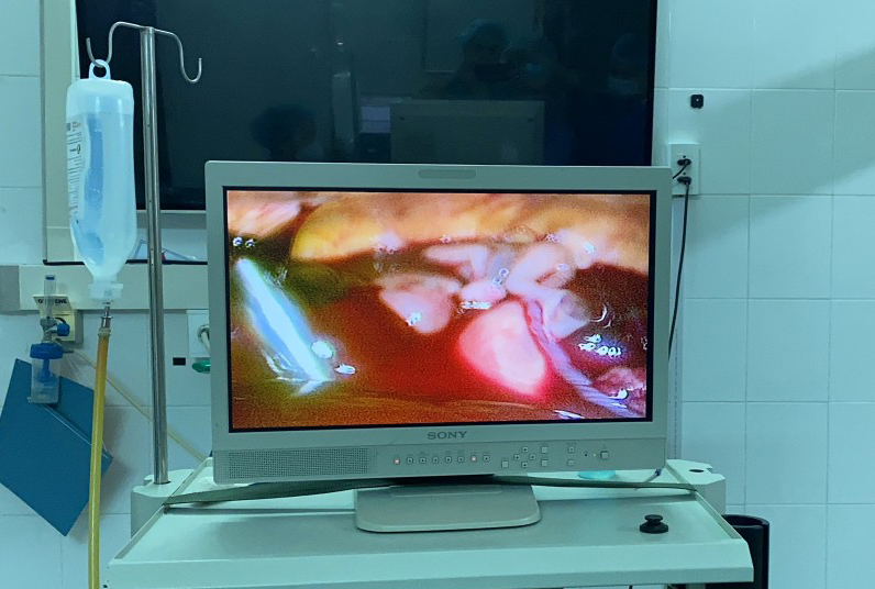 Qua thăm khám, bác sĩ Khoa CSSS Sinh sản ghi nhận: Bụng phản ứng, đau nhiều, âm đạo viêm nhẹ, thân tử cung hơi to, phần phụ phải ấn đau, túi vùng dougla đầy đau, huyết áp 60/40mmHg, test HCG dương tính. Ngay lập tức, các bác sĩ đã hội chẩn thống nhất chẩn đoán bệnh nhân bị sốc mất máu do thai ngoài tử cung vỡ. Ca phẫu thuật được triển khai nhanh chóng do Bs Hà Thị Hồng Thuỷ, Trưởng Khoa Chăm sóc sức khỏe sinh sản trực tiếp thực hiện.