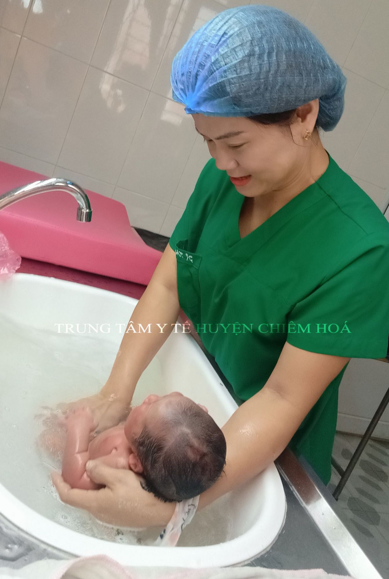 Chị Thuỷ đang tắm cho em bé mới sinh