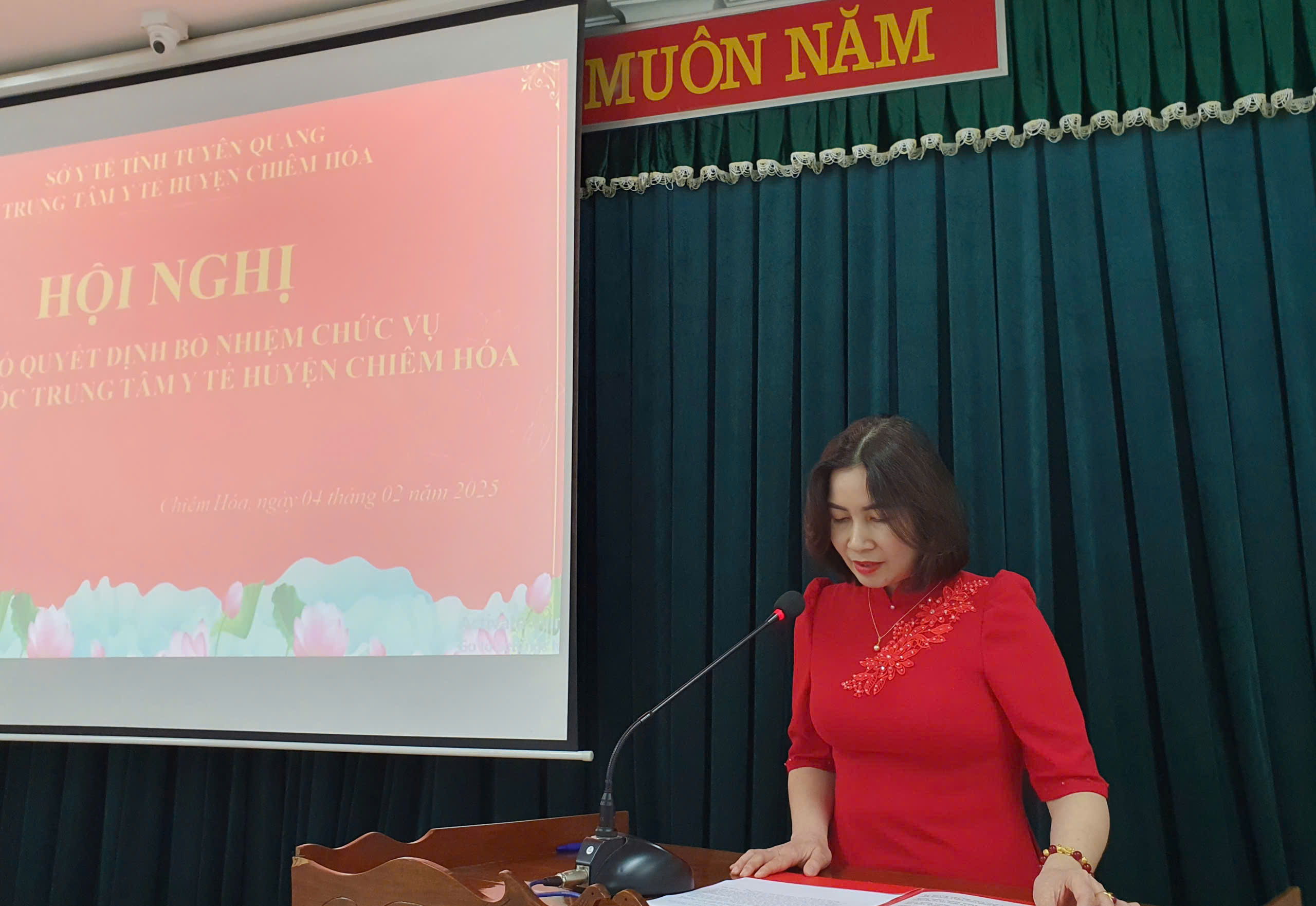 Tại Hội nghị, các đại biểu đã nghe đại diện Sở Y tế công bố quyết định bổ nhiệm bà Trương Thị Việt Hằng – Trưởng phòng Tài chính - Kế hoạch giữ chức vụ Phó Giám đốc Trung tâm Y tế huyện Chiêm Hóa.