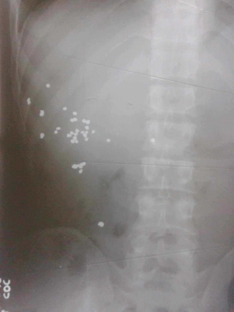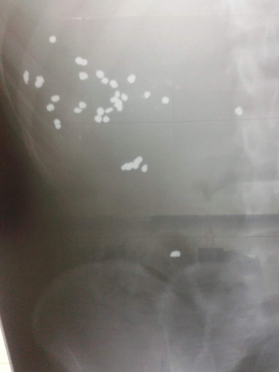 Sau khi chụp X-quang và CT, các bác sĩ phát hiện có nhiều dị vật, nghi là mảnh đạn hoa cải súng săn ở phần hạ sườn trái và đùi trái.