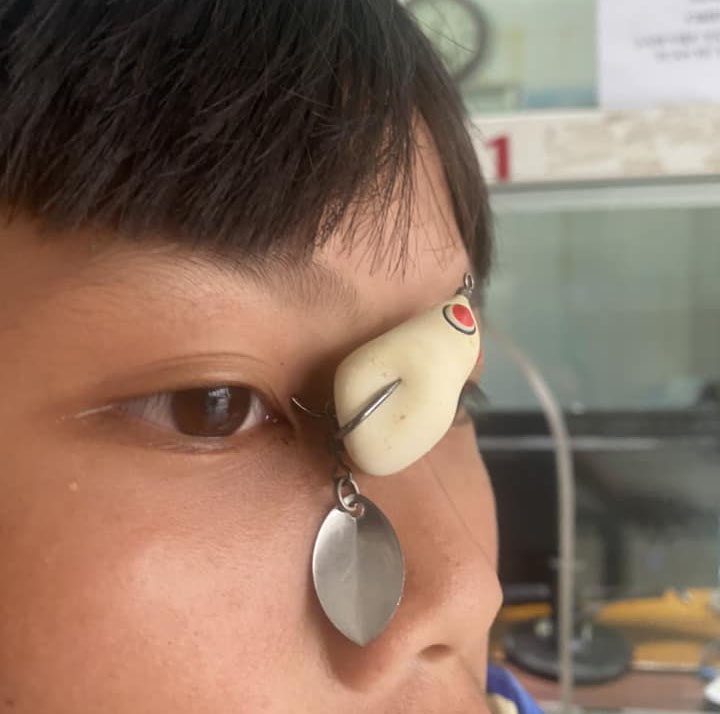 Bệnh nhân L.V.H 13 tuổi (xã Tân An) đi câu cá không may bị lưỡi câu cắm vào mí mắt trên (bên phải).