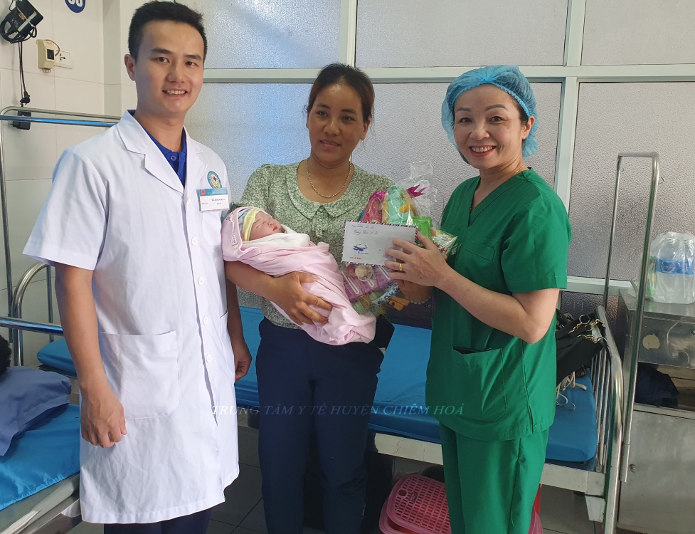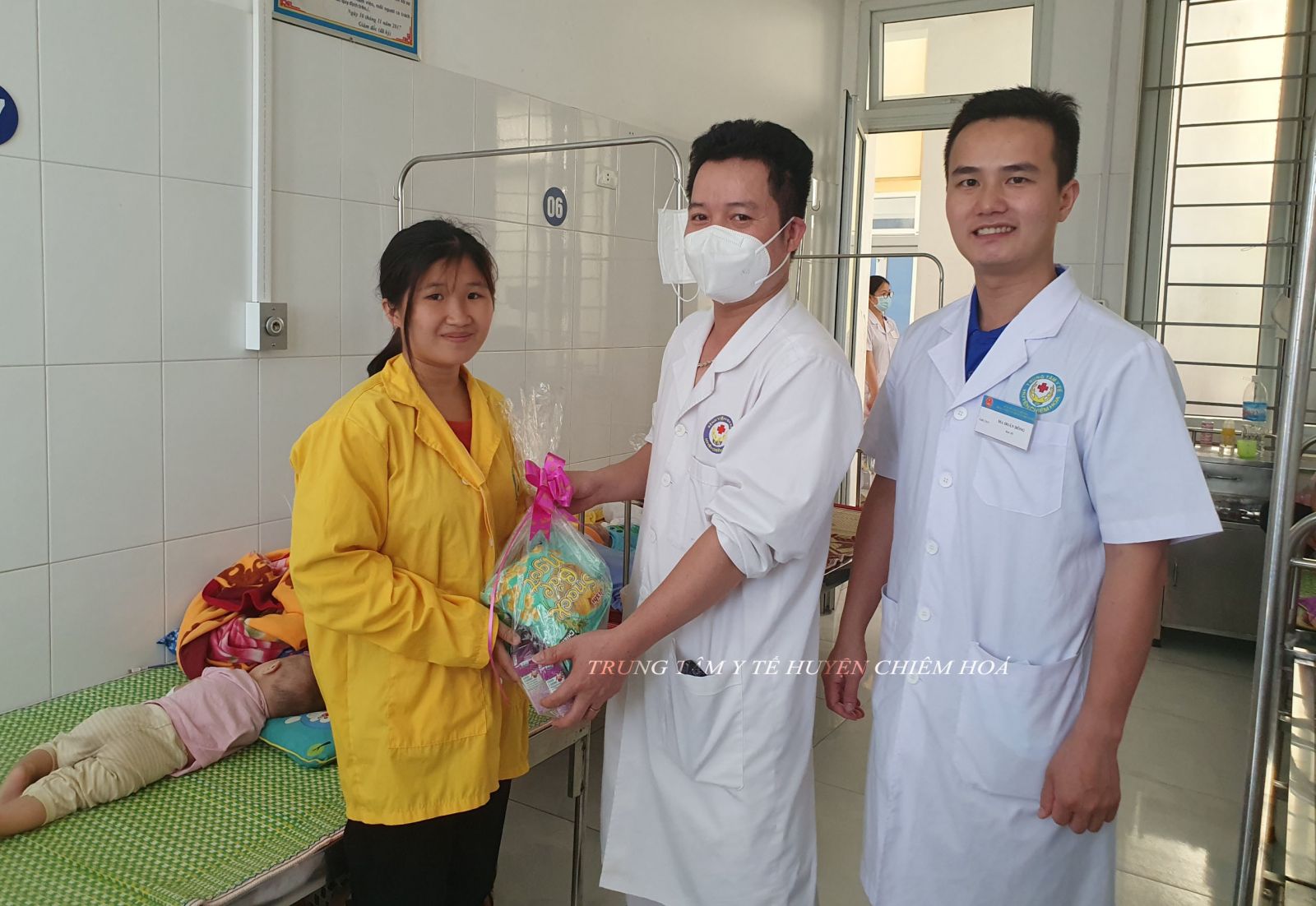 Đ/c Hà Thị Bích Ngọc – PGĐ TTYT và đ/c Ma Doãn Đông Bí thư ĐCS TTYT tặng quà cho em bé sinh ngày 1/6