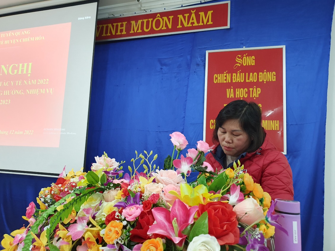 Phát biểu chỉ đạo tại hội nghị, đồng chí Phó Chủ tịch UBND huyện Hà Thị Minh Quang ghi nhận và biểu dương những kết quả Trung tâm y tế huyện Chiêm Hóa đạt trong năm qua. Đồng chí yêu cầu trong thời gian tới Trung tâm tiếp tục làm tốt công tác giáo dục chính trị tư tưởng, đạo đức lối sống, gắn với nâng cao ý thức và thực hiện tốt quy tắc ứng xử cho cán bộ viên chức người lao động. Tiếp tục tăng cường kiểm tra giám sát chặt chẽ các bệnh truyền nhiễm dịch bệnh trên địa bàn huyện. Xây dựng kế hoạch thực hiện tiêu chí quốc gia về Y tế xã theo bộ tiêu chí do Bộ Y tế ban hành. Xây dựng kế hoạch phát triển chuyên môn, đào tạo nhân lực đáp ứng thực hiện nhiệm vụ chính trị của đơn vị. Duy trì và tăng cường chất lượng hội chẩn trực tuyến, khám chữa bệnh từ xa với các bệnh viện tuyến Trung ương. Thực hiện tốt các dịch vụ kĩ thuật đã và đang triển khai nhằm đáp ứng nhu cầu khám chưa bệnh ngày càng cao của người nhân dân. Đảm bảo cung ứng đầy đủ thuốc vật tư, hóa chất, vắcxin, xin phẩm y tế phục vụ cho công tác khám, chữa bệnh và công tác phòng chống dịch bệnh… Xây dựng Trung tâm Y tế huyện Chiêm Hóa ngày càng phát triển, xứng đáng với niềm tin, sự mong đợi của Nhân dân và lời dạy của Bác Hồ “Lương y như từ Mẫu”.