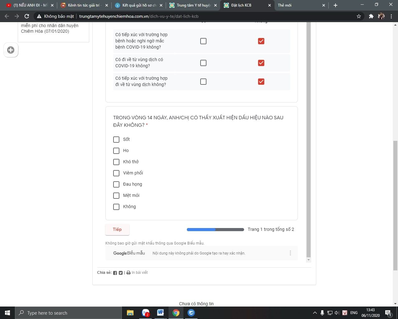 Bước 2: Cập nhật TỜ KHAI Y TẾ (bắt buộc) theo mẫu câu hỏi dưới đây và ấn "TIẾP" để tiếp tục quá trình đặt lịch khám.