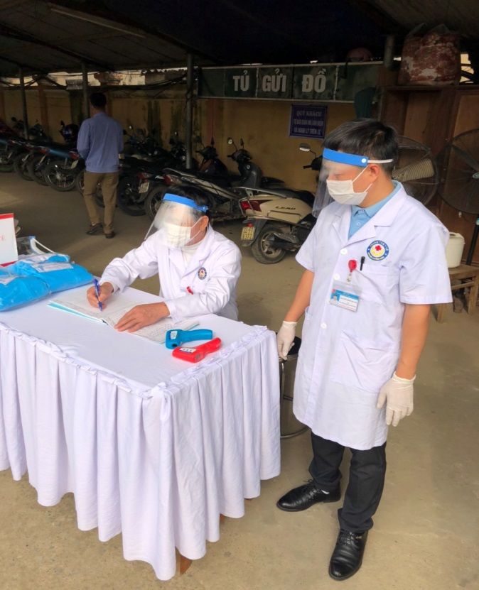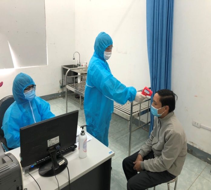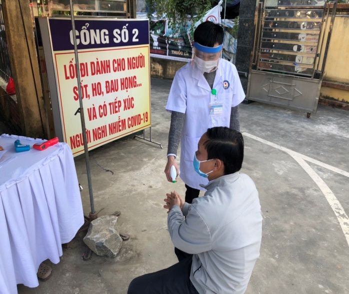 - Tại cổng số 2. Tại đây, anh được nhân viên y tế hướng dẫn sát khuẩn tay nhanh, đo thân nhiệt và khai báo thông tin y tế, hướng dẫn đi theo lối riêng vào khu khám cách ly.