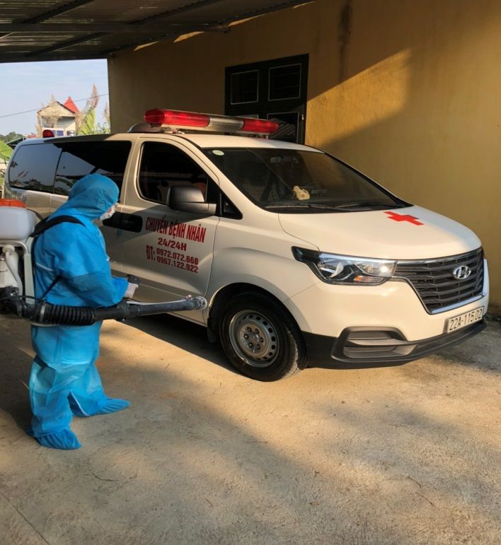 - Đội cơ động phòng chống dịch tiến hành phun khử khuẩn toàn bộ đường đi của khách hàng và khử khuẩn tất cả bề mặt xe cấp cứu sau khi vận chuyển bệnh nhân đi.