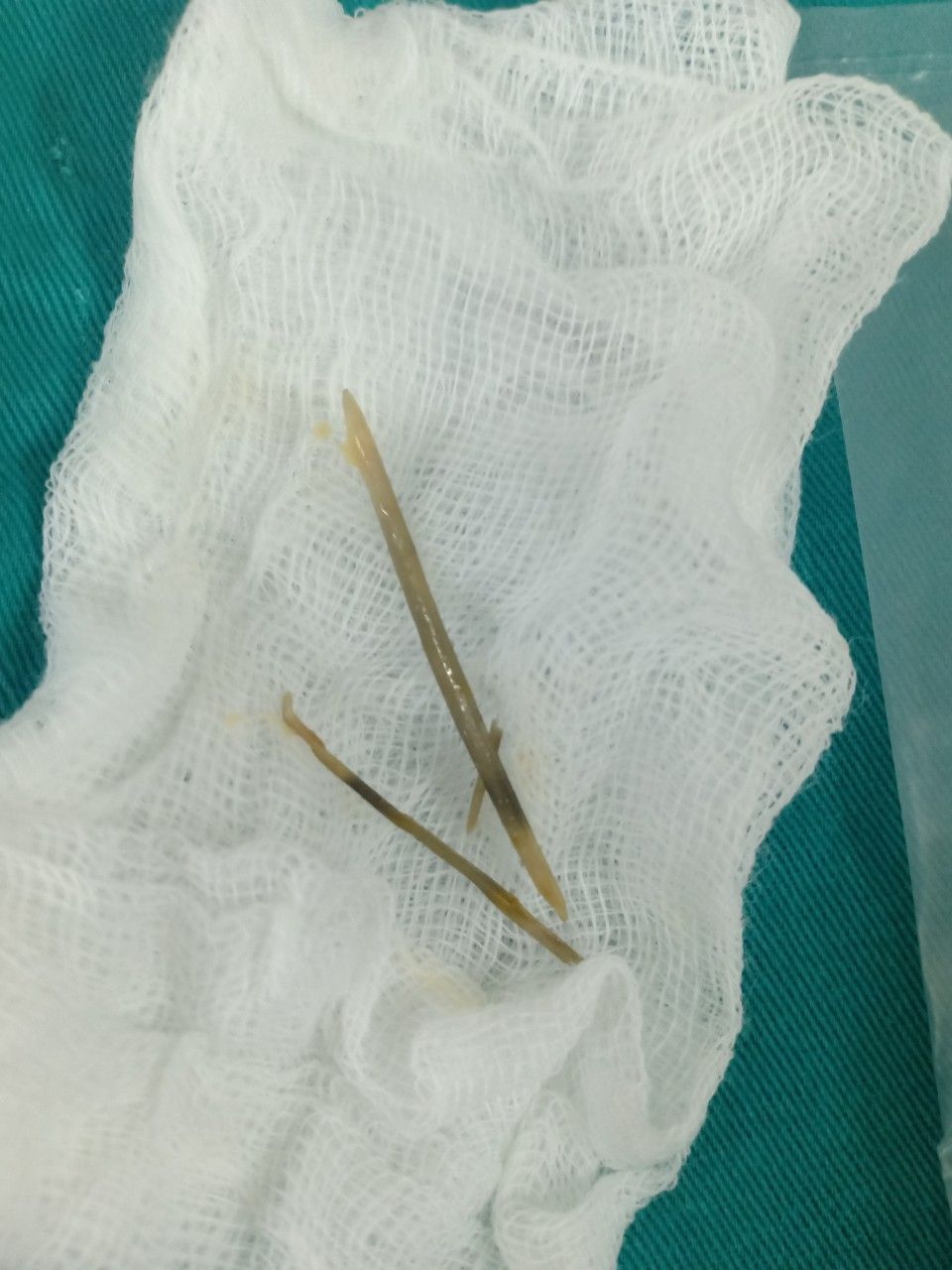 Khi nội soi vào ổ bụng, các bác sĩ phát hiện một xương cá dài gần 4cm đâm xuyên thủng hồi tràng (đoạn cuối ruột non). Bác sĩ đã tiến hành lấy xương cá, làm sạch, khâu lỗ thủng ruột non qua nội soi ổ bụng hoàn toàn.