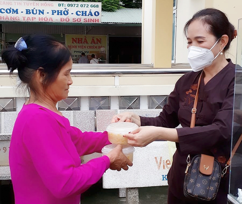 Đồng hành cùng với Trung tâm, Tổ phật tử huyện Chiêm Hóa đã luôn duy trì nồi cháo từ thiện với kinh phí của tổ chức, cá nhân, các nhà hảo tâm trên địa bàn huyện. Hàng trăm xuất cháo nóng hổi, thơm ngon đong đầy tình cảm và sự chia sẻ yêu thương được Tổ phật tử huyện Chiêm Hóa trao đến người bệnh và người nhà bệnh nhân vào sáng thứ 3 hàng tuần... Tất cả các công đoạn từ lựa chọn nguyên liệu, sơ chế, chế biến, tới thành phẩm đều được đảm bảo an toàn, vệ sinh thực phẩm.