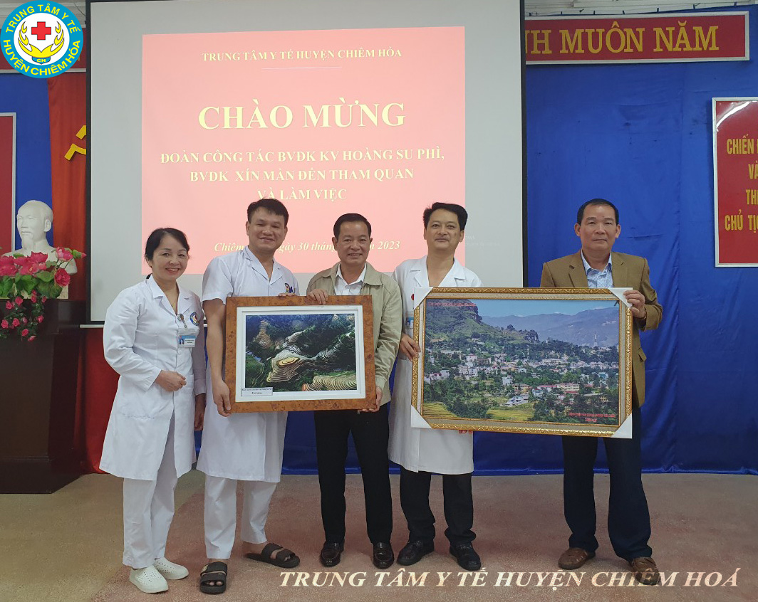 Đoàn BVĐKKV Hoàng Su Phì và BVĐK huyện Xín Mần tỉnh Hà Giang tặng quà lưu niệm cho TTYT huyện Chiêm Hoá