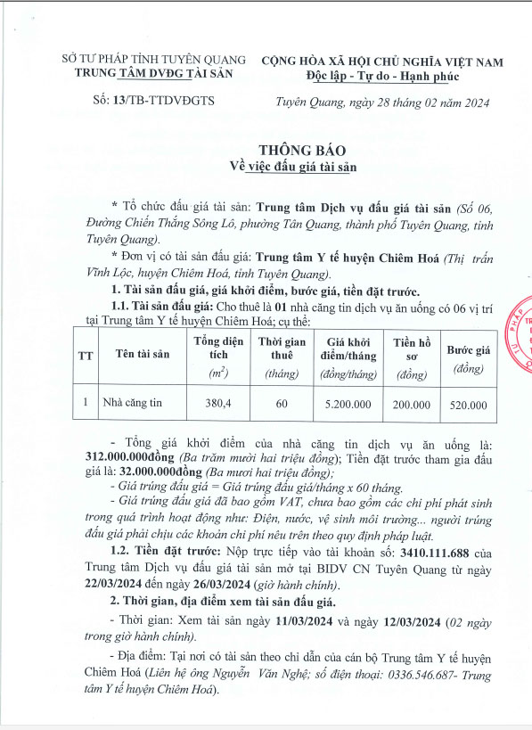 Thứ 6, 01/03/2024 | 08:06 A- A A+ | THÔNG BÁO ĐẤU GIÁ TÀI SẢN dau_gia_tai_san_ttyt_chiem_hoa_01_03_f51952b4df.pdf Đọc bài Lưu Tập tin đính kèm Tổng số điểm của bài viết là: 0 trong 0 đánh giá Click để đánh giá bài viết