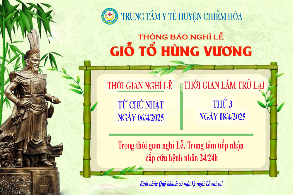 Trung tâm Y tế huyện Chiêm Hóa xin trân trọng thông báo lịch nghỉ lễ Giỗ tổ Hùng Vương 2025 đến Quý bệnh nhân, Quý đối tác như sau: