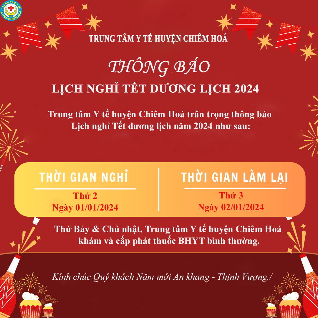 TTYT huyện Chiêm Hoá xin trân trọng thông báo lịch nghỉ tết Dương lịch năm 2024 như sau: