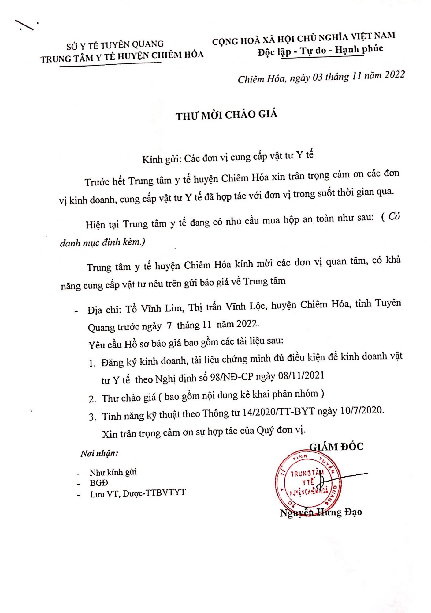 Thứ 3, 08/11/2022 | 10:24 A- A A+ | THƯ MỜI CHÀO GIÁ (08/11/2022) Đọc bài Lưu Tổng số điểm của bài viết là: 0 trong 0 đánh giá Click để đánh giá bài viết