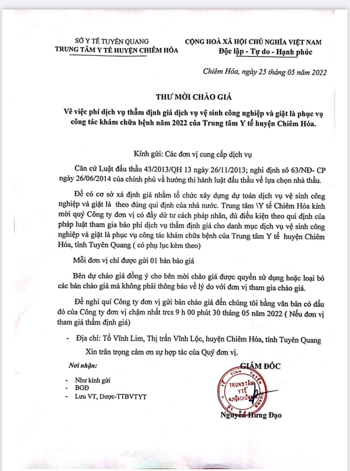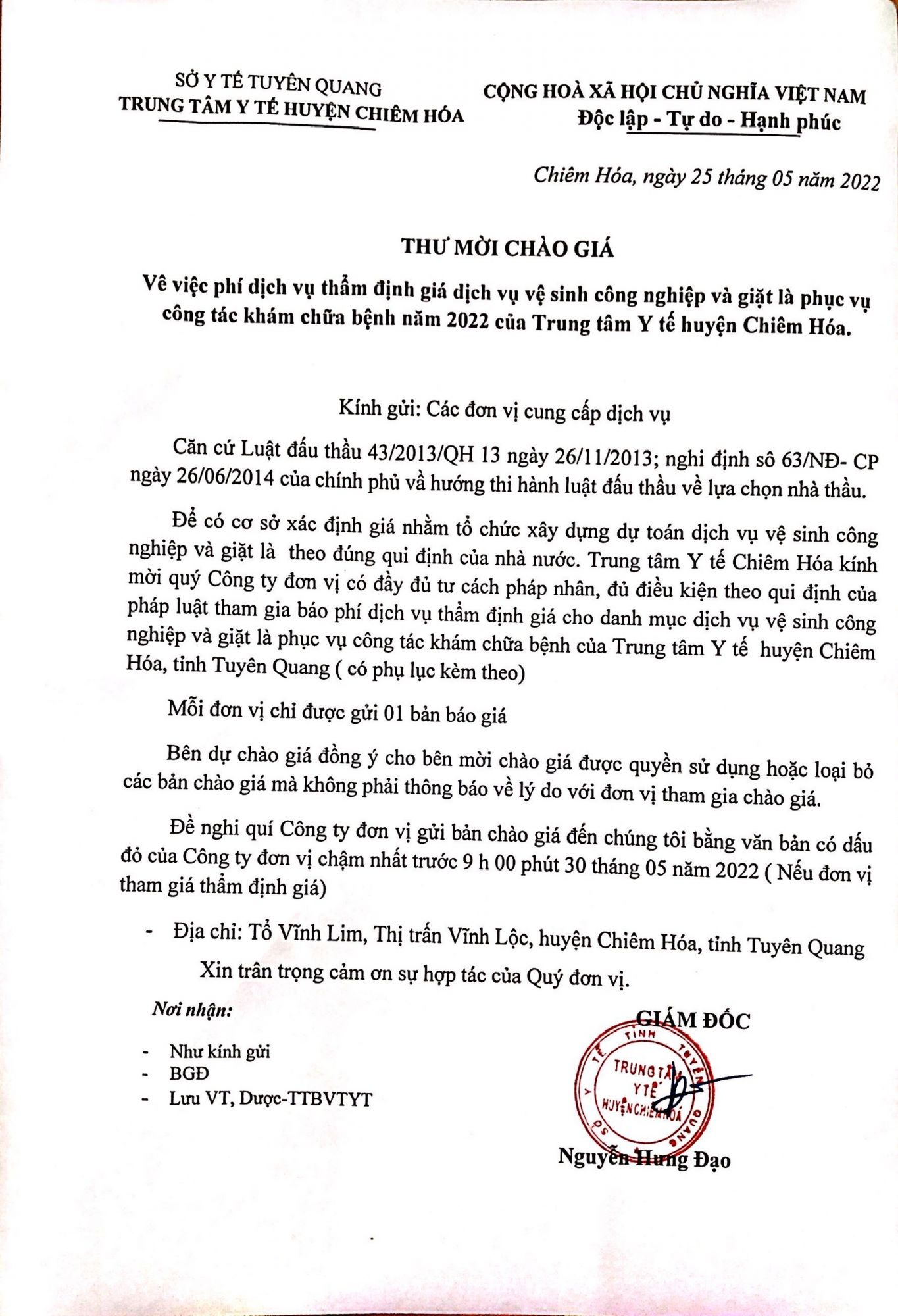 THƯ MỜI CHÀO GIÁ DỊCH VỤ VỆ SINH CÔNG NGHIỆP VÀ GIẶT LÀ PHỤC VỤ CÔNG TÁC KHÁM CHỮA BỆNH NĂM 2002 CỦA TRUNG TÂM Y TẾ HUYỆN CHIÊM HÓA