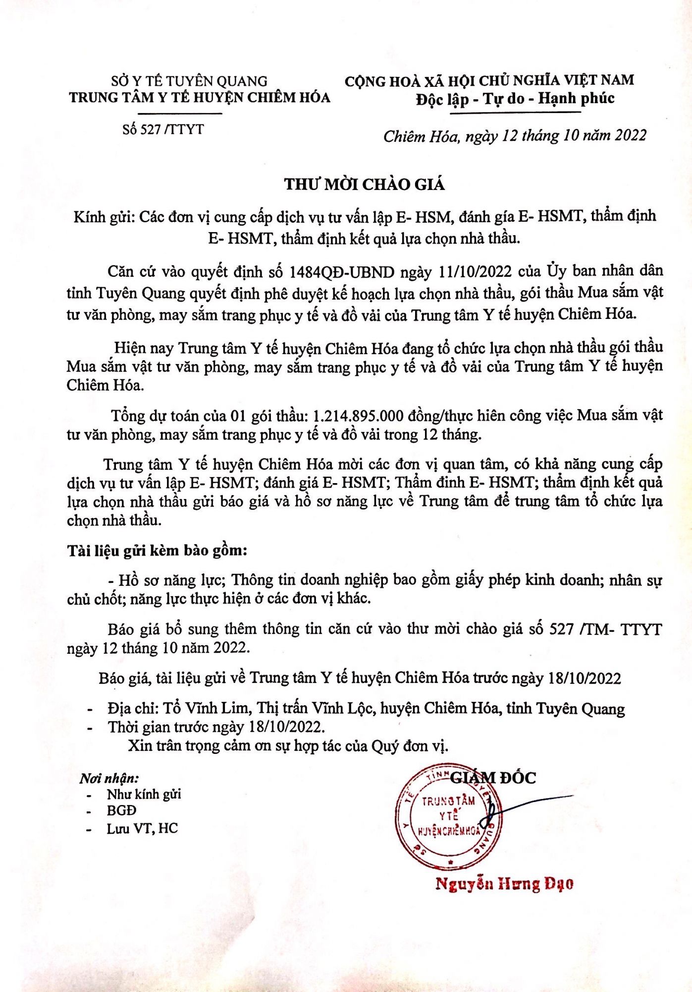 THƯ MỜI CHÀO GIÁ DỊCH VỤ VỆ SINH CÔNG NGHIỆP VÀ GIẶT LÀ PHỤC VỤ CÔNG TÁC KHÁM CHỮA BỆNH NĂM 2002 CỦA TRUNG TÂM Y TẾ HUYỆN CHIÊM HÓA