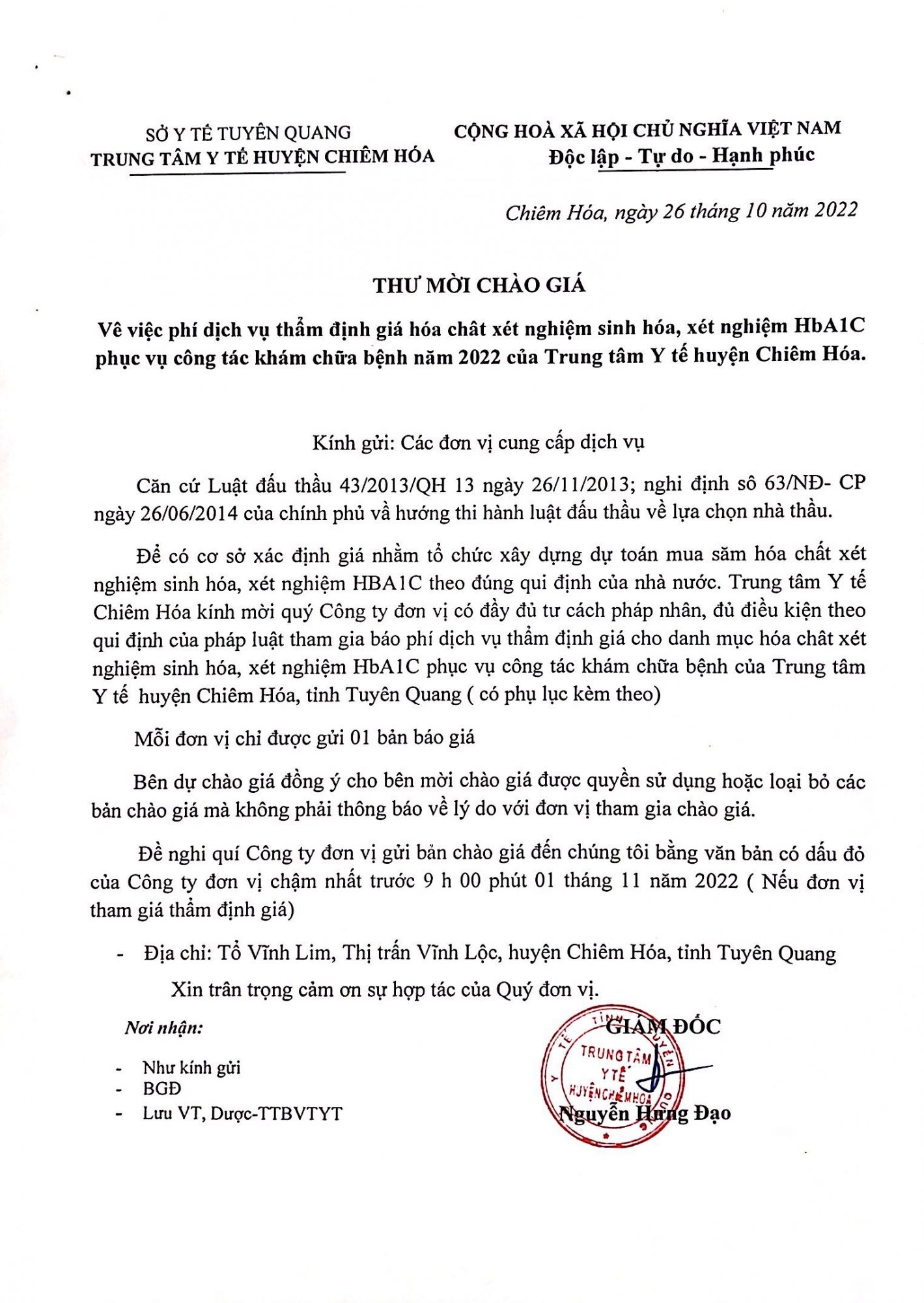 THƯ MỜI CHÀO GIÁ DỊCH VỤ VỆ SINH CÔNG NGHIỆP VÀ GIẶT LÀ PHỤC VỤ CÔNG TÁC KHÁM CHỮA BỆNH NĂM 2002 CỦA TRUNG TÂM Y TẾ HUYỆN CHIÊM HÓA