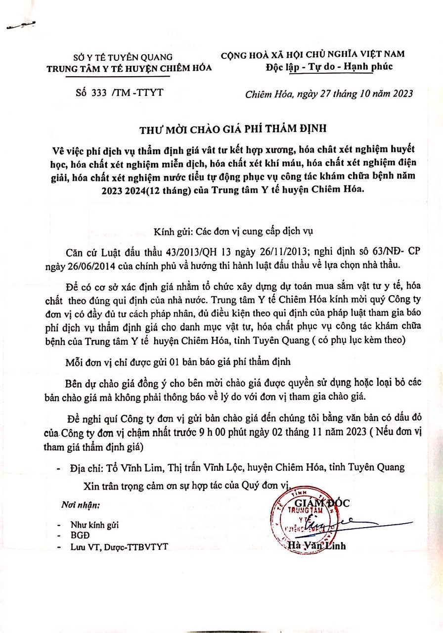 Thứ 6, 27/10/2023 | 11:03 A- A A+ | THƯ MỜI CHÀO GIÁ PHÍ THẨM ĐỊNH "DANH MỤC VẬT TƯ KẾT HỢP XƯƠNG PHỤC VỤ CÔNG TÁC KHÁM CHỮA BỆNH CỦA TRUNG TRUNG TÂM Y TẾ CHIÊM HÓA NĂM 2023" Đọc bài Lưu Tập tin đính kèm Tổng số điểm của bài viết là: 0 trong 0 đánh giá Click để đánh giá bài viết