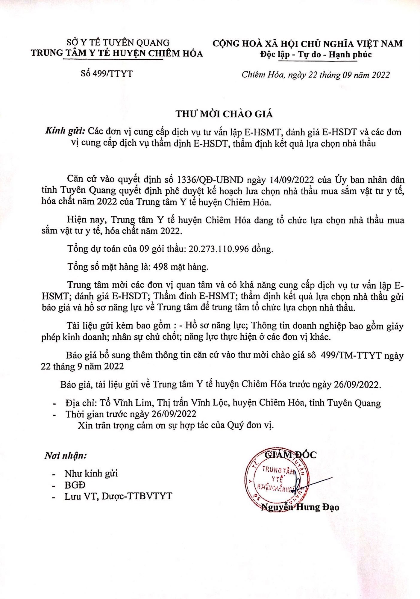 THƯ MỜI CHÀO GIÁ DỊCH VỤ VỆ SINH CÔNG NGHIỆP VÀ GIẶT LÀ PHỤC VỤ CÔNG TÁC KHÁM CHỮA BỆNH NĂM 2002 CỦA TRUNG TÂM Y TẾ HUYỆN CHIÊM HÓA