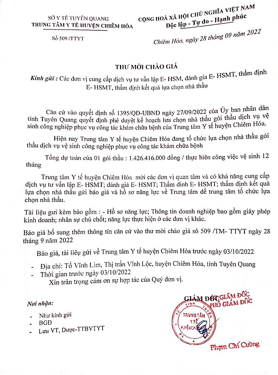 THƯ MỜI CHÀO GIÁ DỊCH VỤ VỆ SINH CÔNG NGHIỆP VÀ GIẶT LÀ PHỤC VỤ CÔNG TÁC KHÁM CHỮA BỆNH NĂM 2002 CỦA TRUNG TÂM Y TẾ HUYỆN CHIÊM HÓA