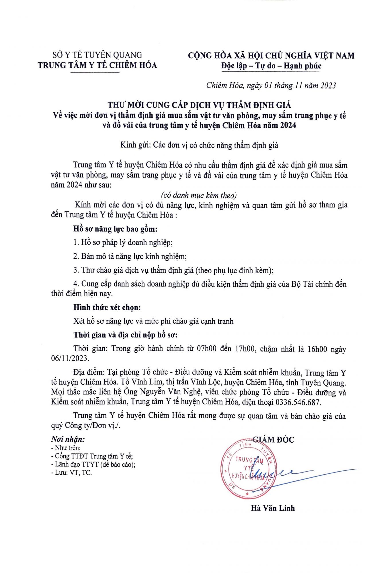 Thứ 4, 01/11/2023 | 09:10 A- A A+ | THƯ MỜI CUNG CẤP DỊCH VỤ THẨM ĐỊNH GIÁ scan_danh_muc_tham_dinh_gia_e8c6eeb70c.pdf Đọc bài Lưu Tập tin đính kèm Tổng số điểm của bài viết là: 0 trong 0 đánh giá Click để đánh giá bài viết