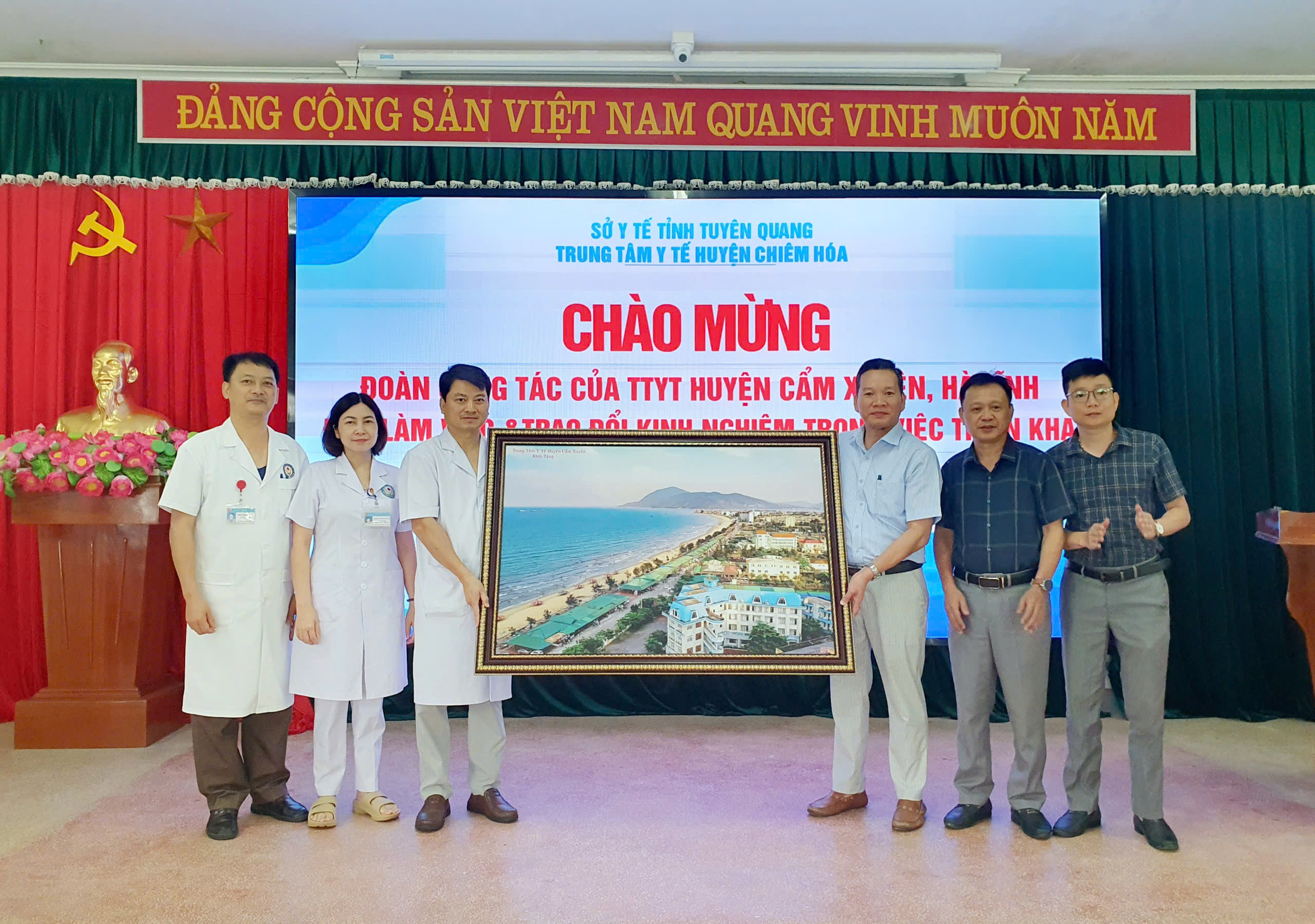 Sáng ngày 26/5, Đoàn công tác TTYT huyện Cẩm Xuyên (Hà Tĩnh) đã đến thăm và làm việc tại Trung tâm Y tế huyện Chiêm Hoá. Tiếp và làm việc với đoàn công tác có BS.CKII Hà Văn Linh - Giám đốc TTYT, Ban giám đốc, đại diện các khoa, phòng của TTYT huyện.